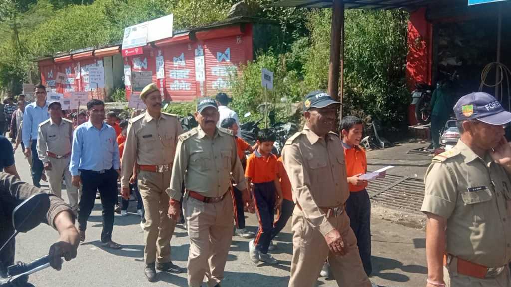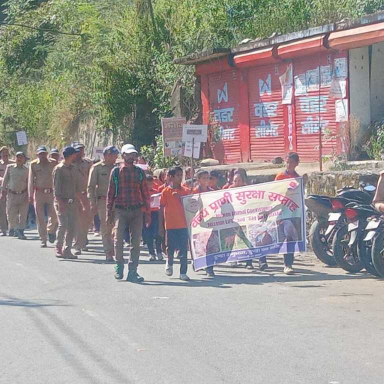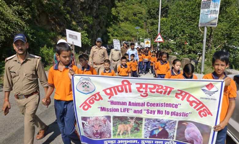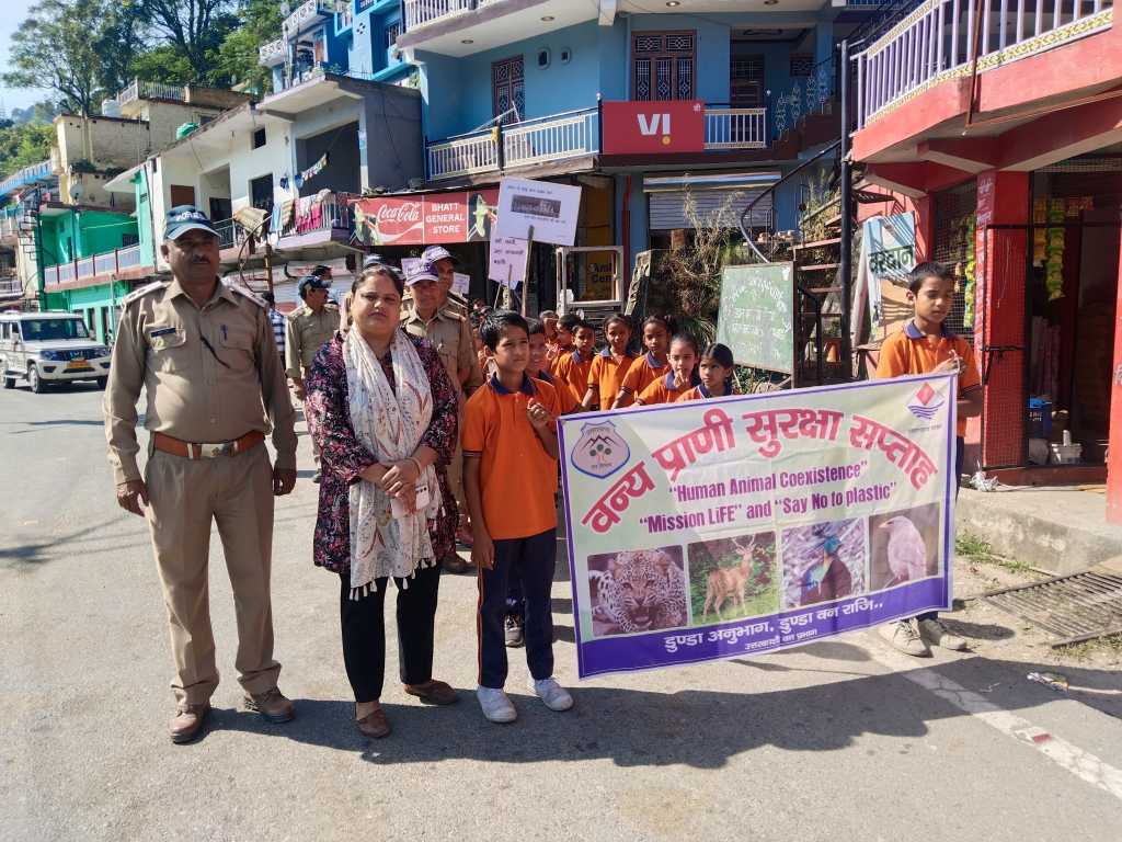 उत्तरकाशी।वन्य प्राणी सुरक्षा सप्ताह के अवसर पर सरस्वती शिशु मंदिर, डुंडा के छात्र-छात्राओं और डुंडा रेंज के वनकर्मियों ने संयुक्त रूप से डुंडा बाजार में भव्य जन-जागरूकता रैली निकाली।