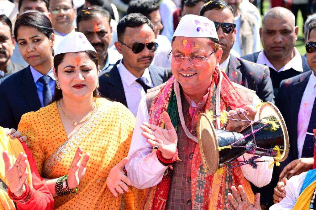 मुख्यमंत्री आवास का प्रांगण सोमवार को होली के रंगों में सराबोर नजर आया। इस दौरान प्रदेश की सांस्कृतिक समृद्धि और एकता के भी दर्शन हुए। पूर्वाह्न से ही प्रदेश भर के लोक कलाकारों, संस्कृति कर्मियों की टोलियां होली गायन करते हुए सीएम आवास पहुंचती रही। एक तरफ गढ़वाल-कुमाऊं से लेकर जौनसार तक का होली गायन था, नृत्य था। इस दौरान होली के गीत गूंजे। पारंपरिक गायन हुआ। ढोल, मंजीरे बजे। पारंपरिक वाद्य यंत्रों की संगत ने होली गीतों के प्रभाव को और बढ़ा दिया। ‘आओ दगड़ियो, नाचा गावा, आ गई रंगीली होली’ का आह्वान यदि कुमाऊं से आए कलाकारों ने किया, तो राठ क्षेत्र के कलाकारों ने गाया- ‘आई डान्ड्यू बसंत, डाली मा मौल्यार’।
