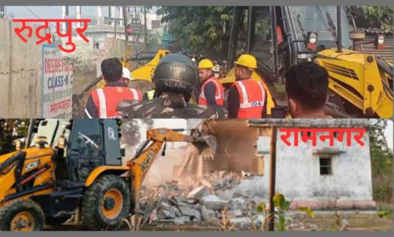रुद्रपुर/रामनगर।उत्तराखंड में प्रशासन ने दो बड़ी कार्रवाईयों के तहत अवैध अतिक्रमण पर कड़ा रुख दिखाया। रुद्रपुर के खेड़ा ईदगाह के पास 8 एकड़ नजूल भूमि पर मदरसा सोसाइटी का अवैध कब्जा हटाया गया। नगर निगम की टीम ने चारदीवारी ध्वस्त कर भूमि को कब्जे में लिया। सुरक्षा के लिए भारी पुलिस बल और पीएसी तैनात किया गया।