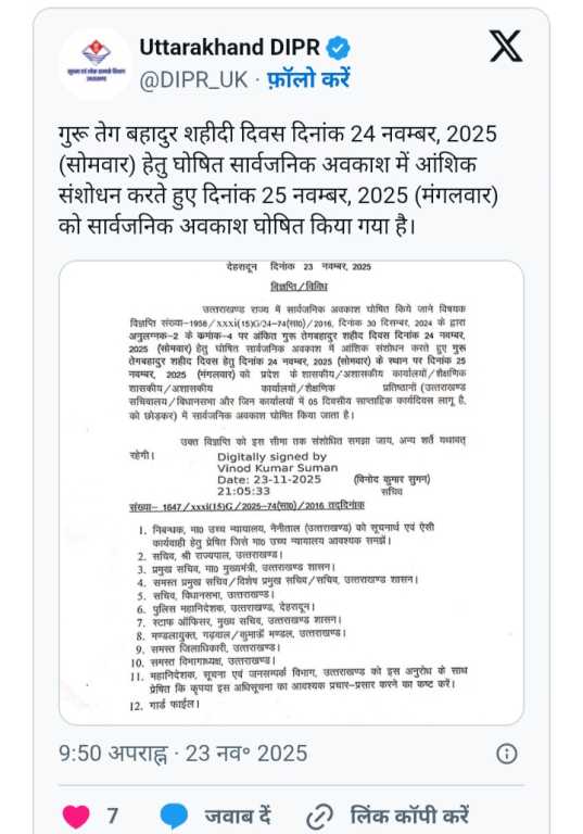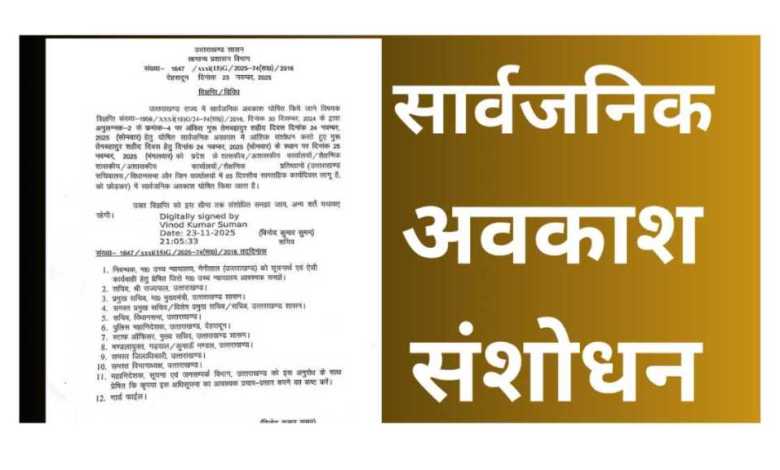 देहरादून। उत्तराखंड सरकार ने गुरु तेग बहादुर शहीदी दिवस पर घोषित सार्वजनिक अवकाश में संशोधन किया है। पहले यह अवकाश 24 नवंबर को निर्धारित था, लेकिन अब इसे बदलकर 25 नवंबर कर दिया गया है। सरकार की ओर से जारी नए आदेश के अनुसार पूरे प्रदेश में अब 25 नवंबर (मंगलवार) को ही सार्वजनिक अवकाश रहेगा।
