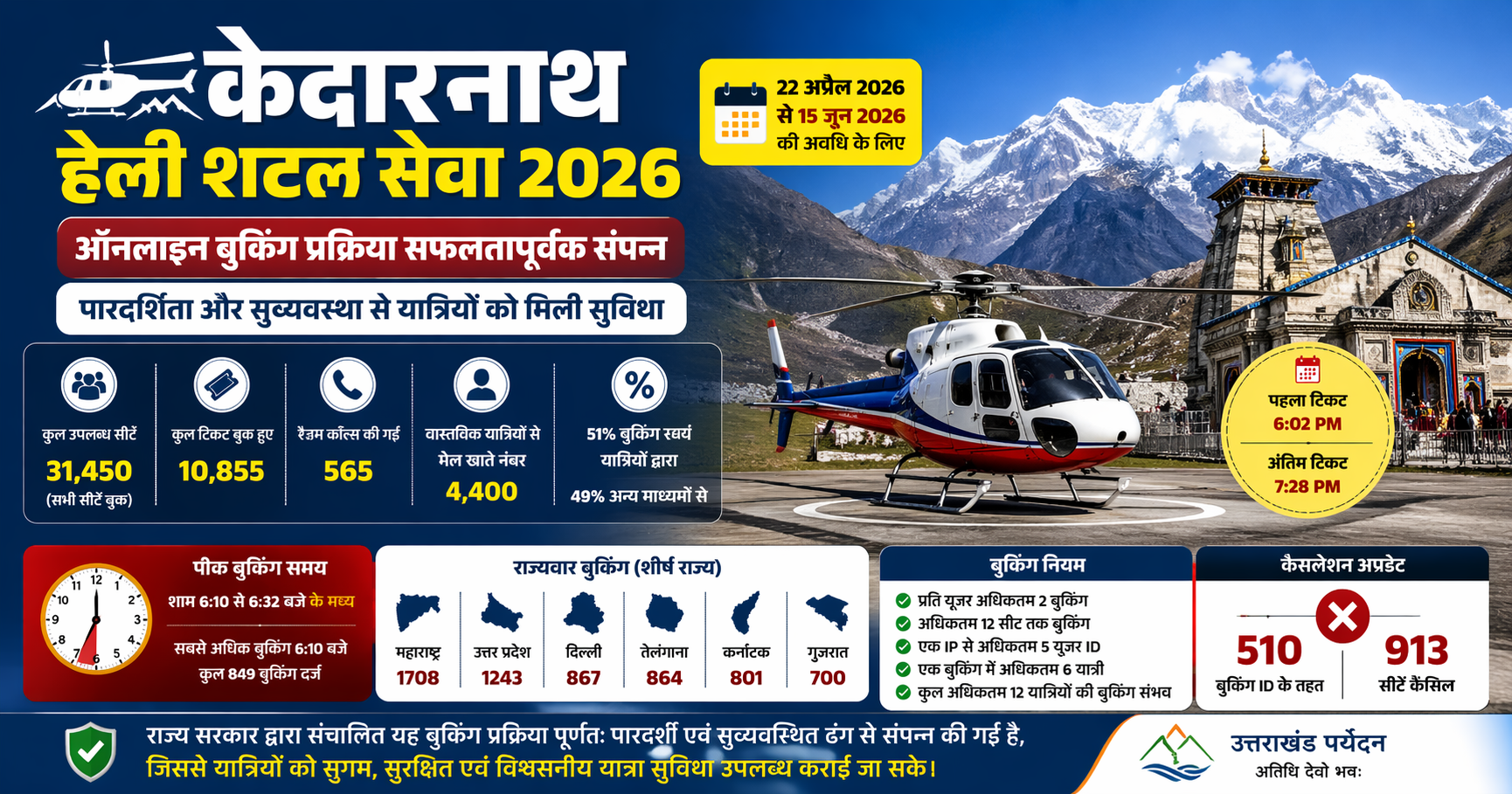 देहरादून।दिनांक 15 अप्रैल 2026 को सायं 6:00 बजे से श्री केदारनाथ हेली शटल सेवा के लिए 22 अप्रैल 2026 से 15 जून 2026 की अवधि हेतु ऑनलाइन बुकिंग  के हेली यात्रा बुकिंग पोर्टल के माध्यम से प्रारंभ की गई। निर्धारित अवधि के लिए कुल 31,450 सीटों की बुकिंग खोली गई, जिनमें 10,855 टिकटों के माध्यम से सभी 31,450 सीटों की सफलतापूर्वक बुकिंग की गई।