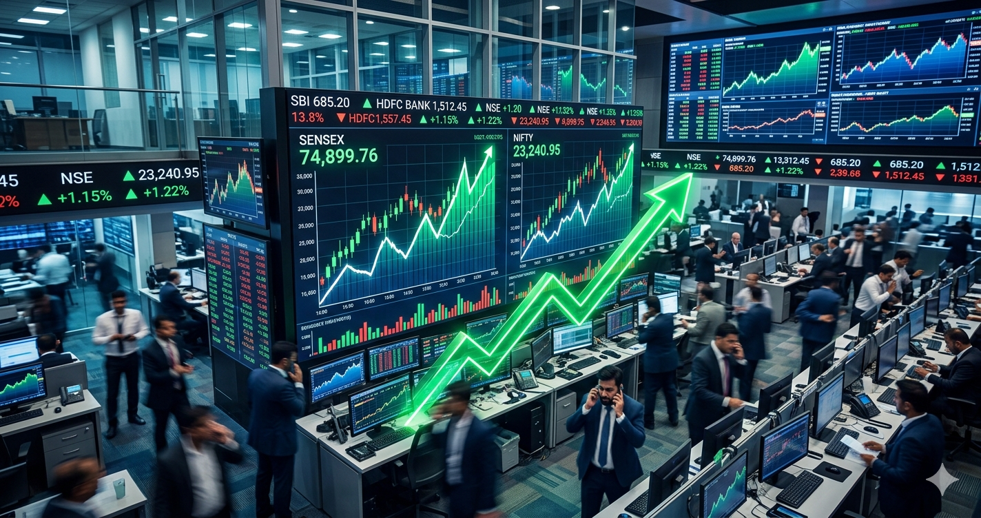 हालांकि, जैसे ही बाजार निचले स्तरों पर पहुँचा, दिग्गज बैंकों और ब्लू-चिप कंपनियों के शेयरों में खरीदारी की होड़ मच गई। देखते ही देखते सेंसेक्स (Sensex) 342.02 अंक उछलकर 74,899.76 पर और निफ्टी (Nifty) 88.55 अंक की बढ़त के साथ 23,240.95 के स्तर पर जा पहुँचा। बाजार की इस ‘रिकवरी’ (Recovery) ने निवेशकों को बड़ी राहत दी है।
