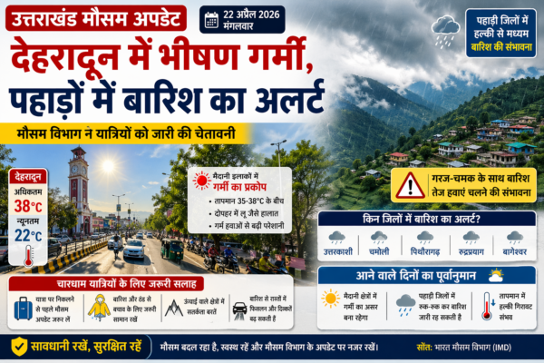 देहरादून/उत्तराखंड: उत्तराखंड में मौसम ने एक बार फिर करवट ले ली है। जहां मैदानी इलाकों में भीषण गर्मी ने लोगों का हाल बेहाल कर दिया है, वहीं पहाड़ी जिलों में बारिश और बादलों की आवाजाही से मौसम सुहावना बना हुआ है। मौसम विभाग के अनुसार आने वाले दिनों में प्रदेश में मौसम का यह मिश्रित…