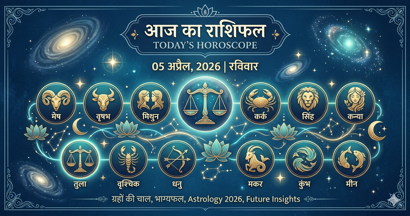 ​05 अप्रैल 2026, रविवार के दिन ब्रह्मांड में ग्रहों की स्थिति अत्यंत प्रभावशाली है। चंद्रमा आज तुला राशि में गोचर कर रहे हैं, जो सीधे तौर पर हमारे संबंधों, संतुलन और आंतरिक शांति को प्रभावित करेगा। आज का राशिफल (Today’s Horoscope) केवल भविष्य की गणना नहीं है, बल्कि यह समय की उस ऊर्जा का संकेत है जो आपके निर्णय लेने की क्षमता को दिशा देती है। आइए जानते हैं, ग्रहों की चाल के अनुसार आज आपके भाग्यफल के पिटारे में क्या है।