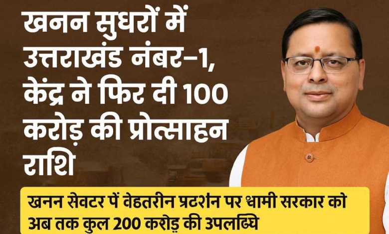 देहरादून।मुख्यमंत्री पुष्कर सिंह धामी के नेतृत्व में खनन क्षेत्र में उल्लेखनीय प्रदर्शन और लगातार सुधारों के चलते उत्तराखंड एक बार फिर केंद्र सरकार से बड़ी प्रोत्साहन राशि हासिल करने में सफल रहा है। केंद्र के खान मंत्रालय ने वर्ष 2025-26 की विशेष सहायता योजना (SASCI) के तहत उत्तराखंड को माइनर मिनरल्स रिफॉर्म्स मैं 100 करोड़ रुपये की अतिरिक्त प्रोत्साहन राशि प्रदान की है। इससे पहले भी माह अक्टूबर 2025 मैं राज्य को एसएमआरआई रैंकिंग मैं दूसरा स्थान प्राप्त होने पर 100 करोड़ रुपये की प्रोत्साहन राशि मिल चुकी है। इस प्रकार खनन क्षेत्र में उत्कृष्ट सुधारों और बेहतर नीतियों की बदौलत उत्तराखंड को कुल 200 करोड़ रुपये की प्रोहोत्सन राशि प्राप्त हो चुकी है।